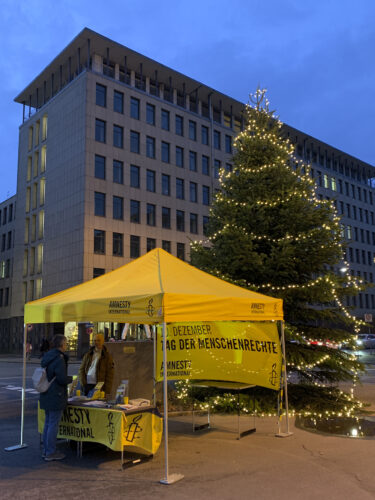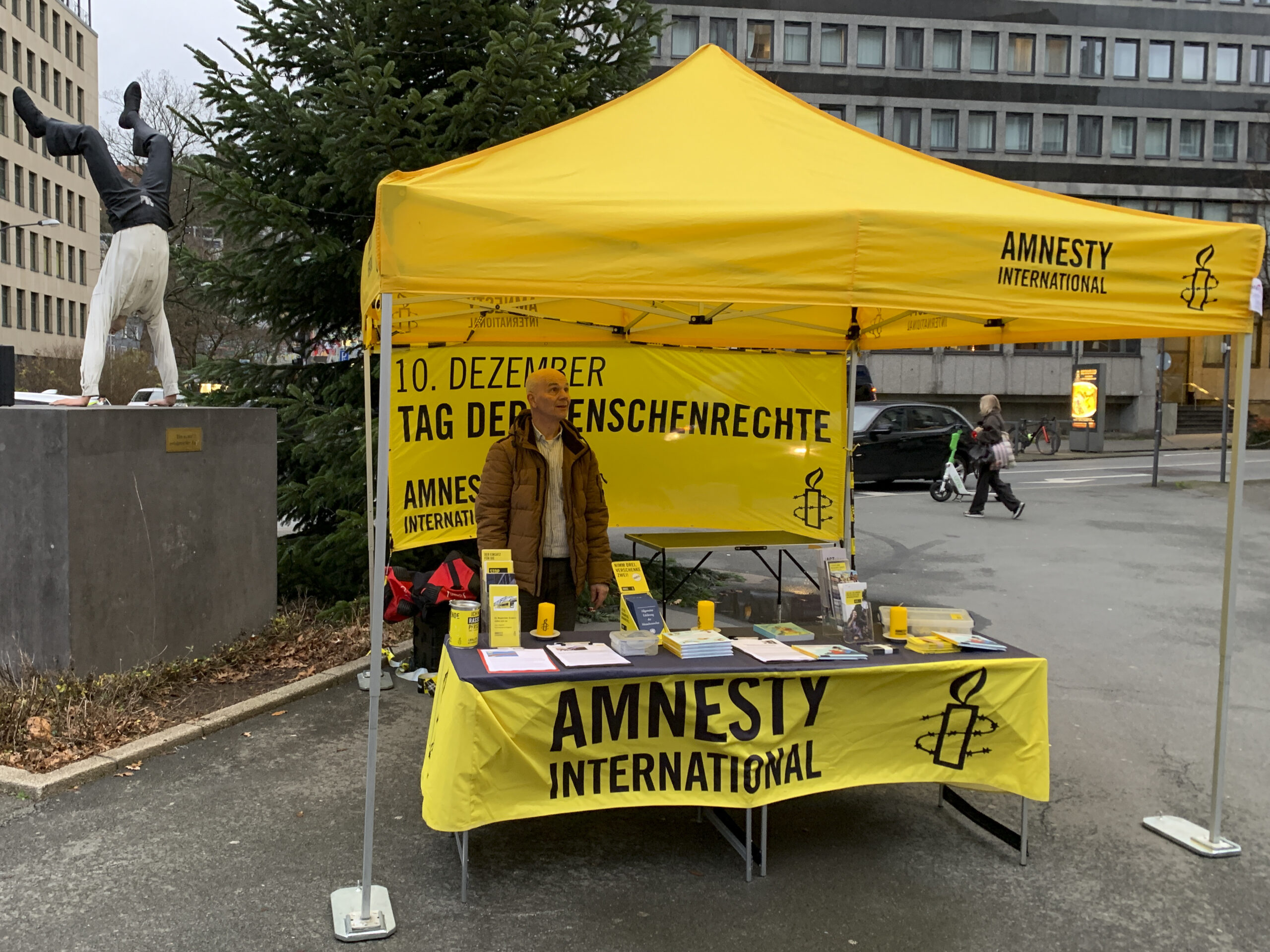 Pünktlich zum Internationalen Tag der Menschenrechte baute die Wuppertaler Gruppe von Amnesty International in der Fußgängerzone in Elberfeld einen Informationsstand auf. Aktuell zur Debatte über die Verwässerung des europäischen Lieferkettengesetzes konnten sich die Passanten über den Zusammenhang von Kinderarbeit z. B. im Kongo und Produkten der Unterhaltungsindustrie für den „Gabentisch“ informieren. Der Rennen war das Amnesty-Kinderbuch zur Allgemeinen Erklärung der Menschenrechte. Darin werden die dreißig Artikel der Allgemeinen Erklärung der Menschenrechte für Kinder verständlich formuliert und mit vielen Beispielen verbildlicht.