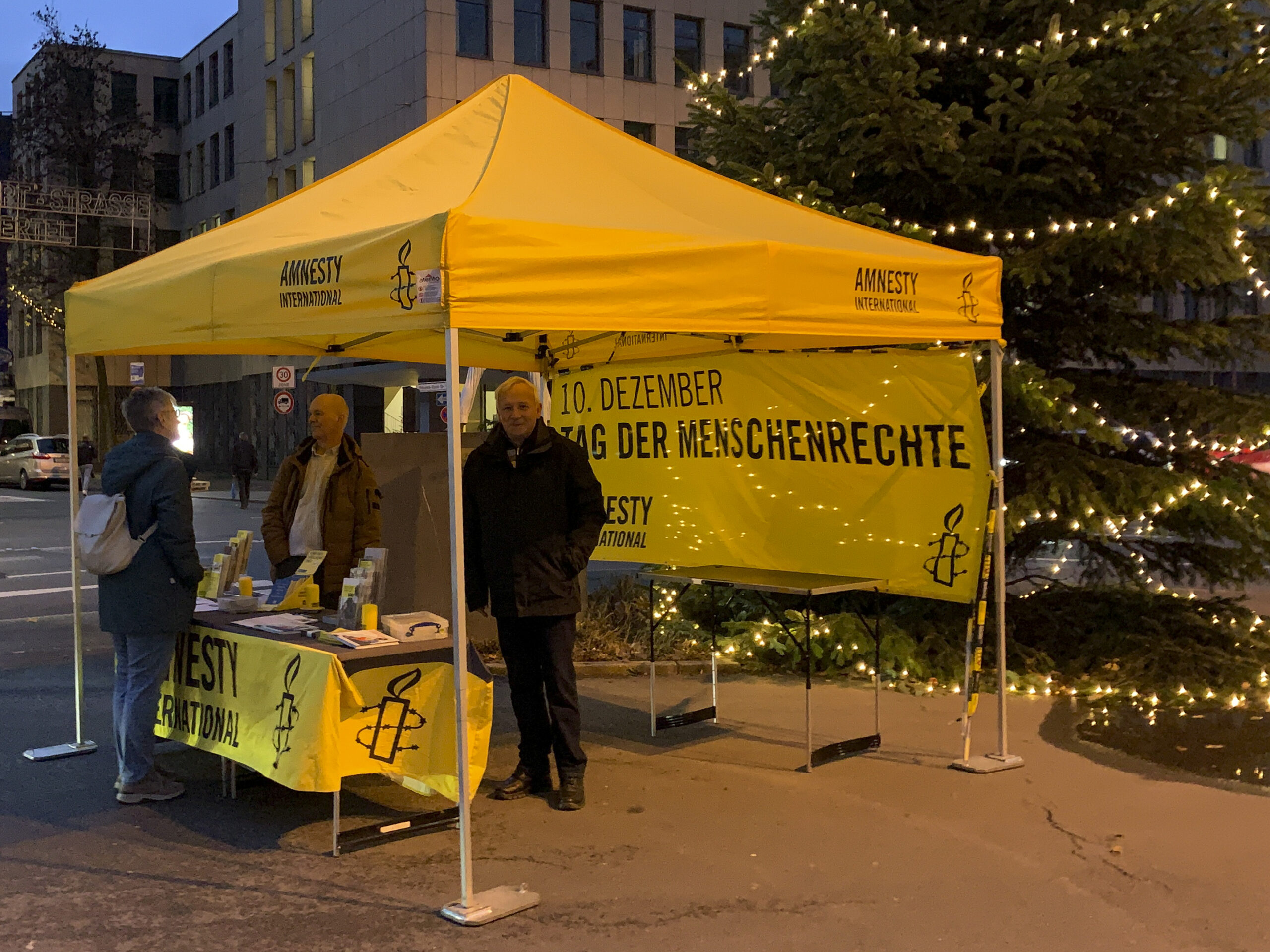Pünktlich zum Internationalen Tag der Menschenrechte baute die Wuppertaler Gruppe von Amnesty International in der Fußgängerzone in Elberfeld einen Informationsstand auf. Aktuell zur Debatte über die Verwässerung des europäischen Lieferkettengesetzes konnten sich die Passanten über den Zusammenhang von Kinderarbeit z. B. im Kongo und Produkten der Unterhaltungsindustrie für den „Gabentisch“ informieren. Der Rennen war das Amnesty-Kinderbuch zur Allgemeinen Erklärung der Menschenrechte. Darin werden die dreißig Artikel der Allgemeinen Erklärung der Menschenrechte für Kinder verständlich formuliert und mit vielen Beispielen verbildlicht.